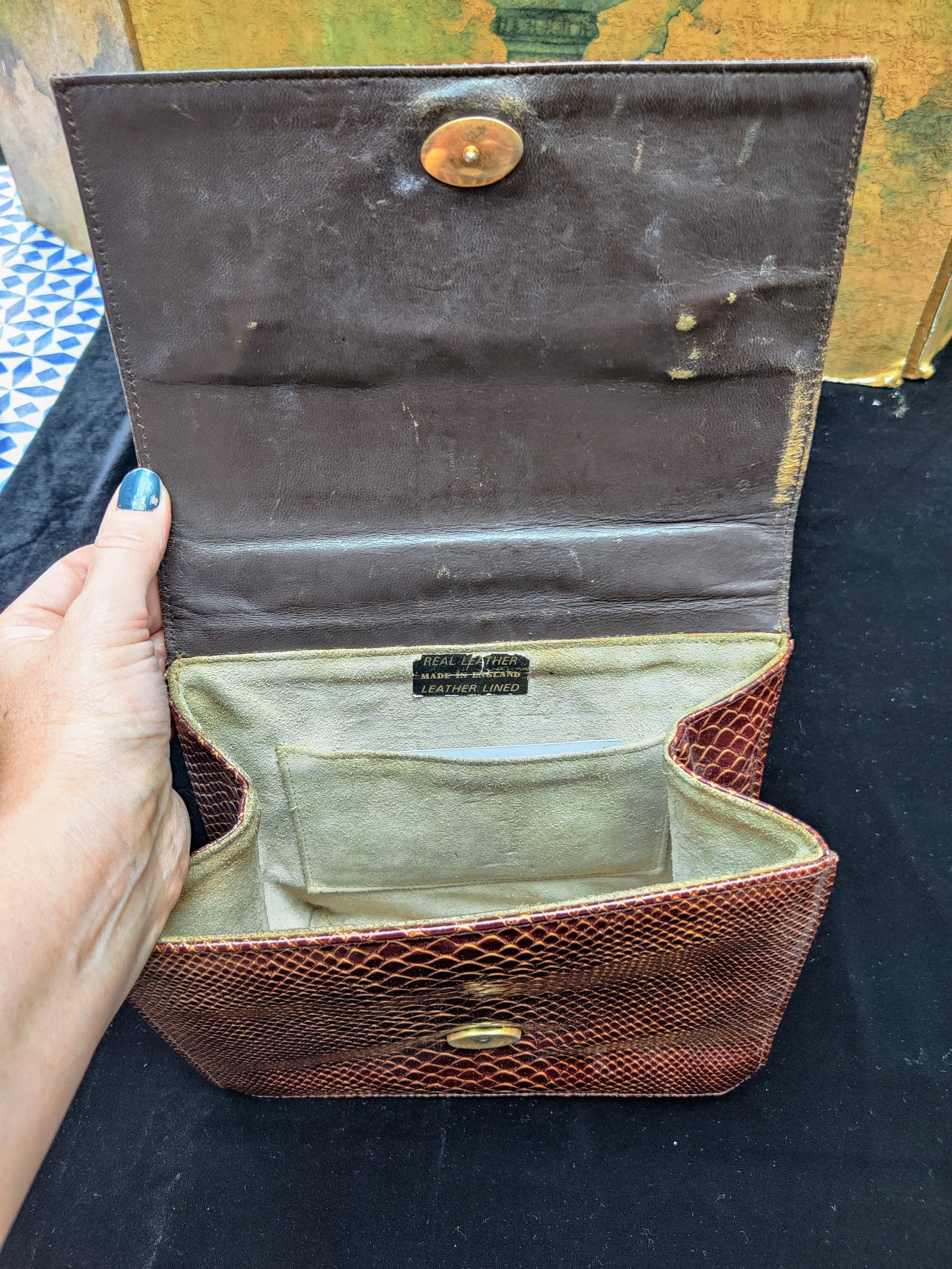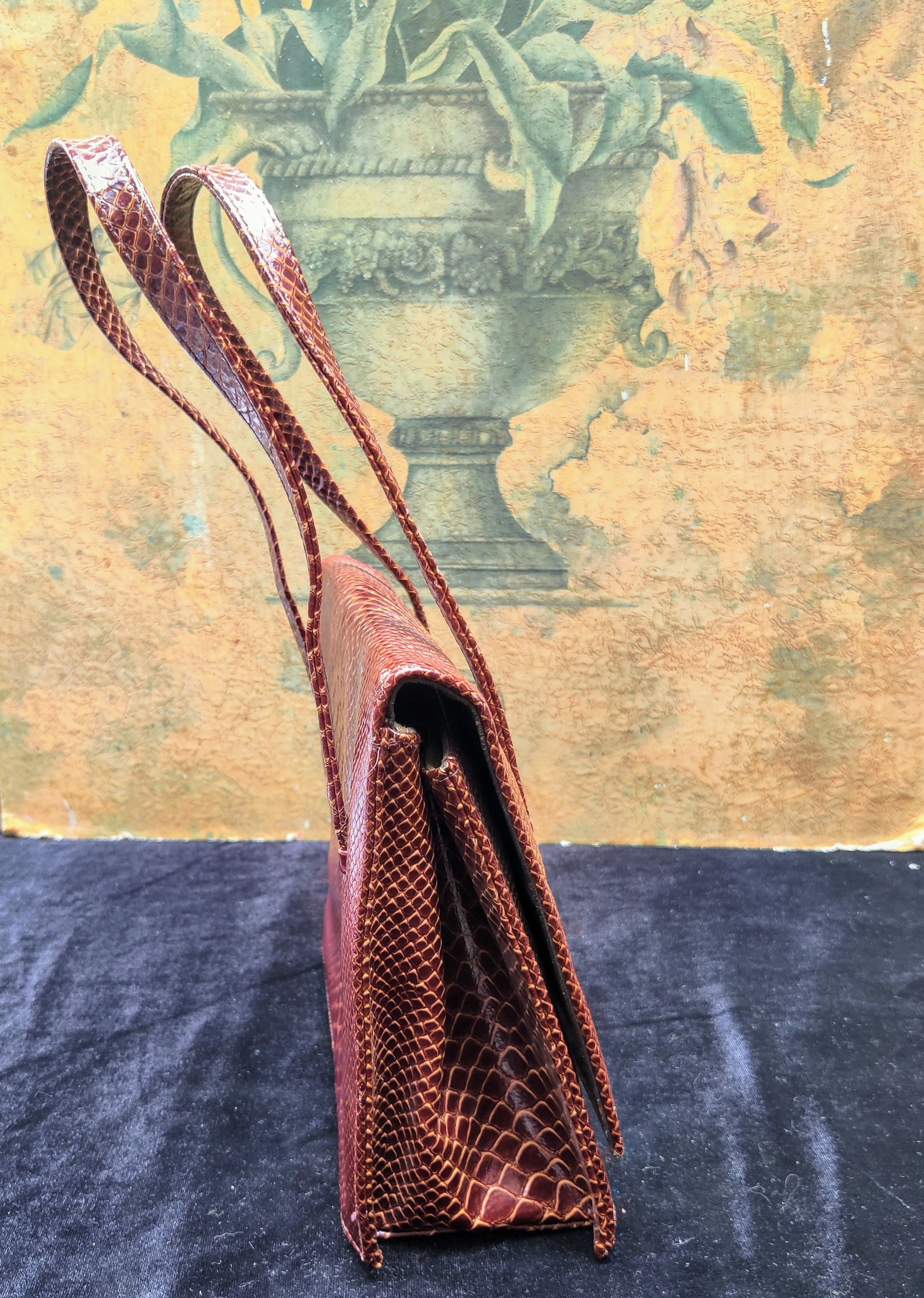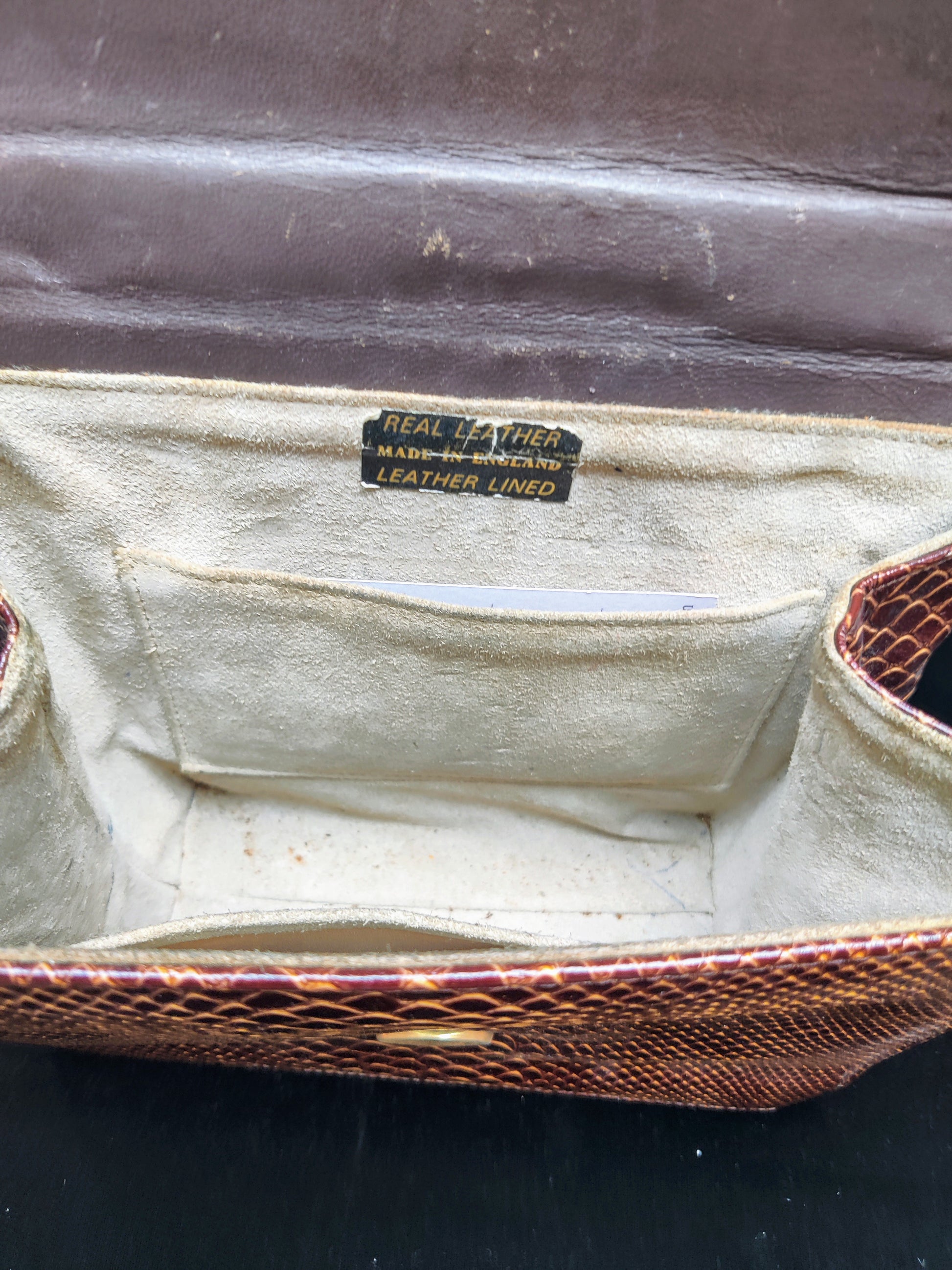 This leather bag is beautifully made. The mock croc outer is gorgeous and the metal hardware gives it a really unique twist. It is a beautifully rich brown tan colour.