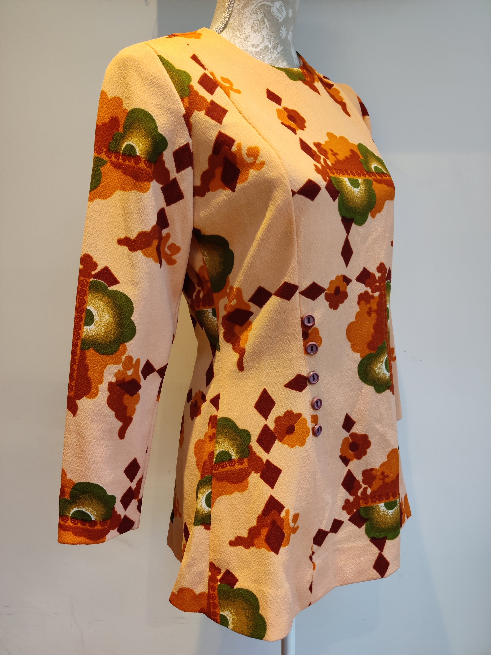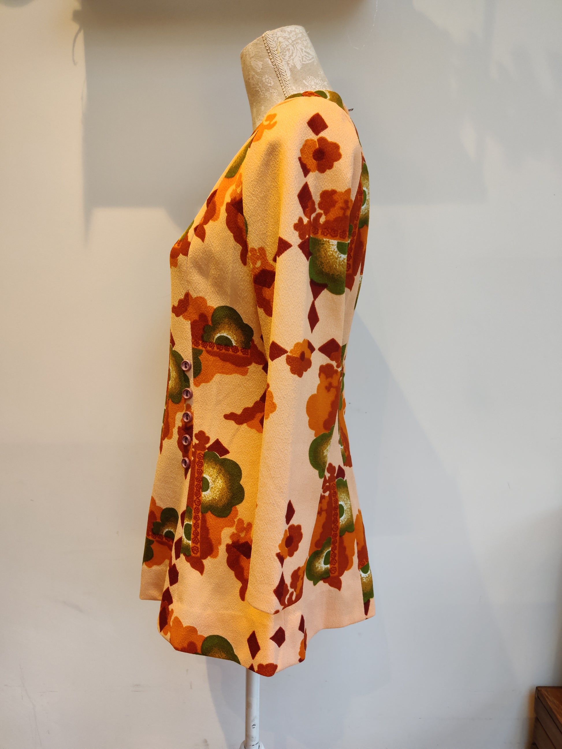 This 60s tunic is lovely. It's a beautiful abstract 60s print in a nice combo of peach, orange and green.
