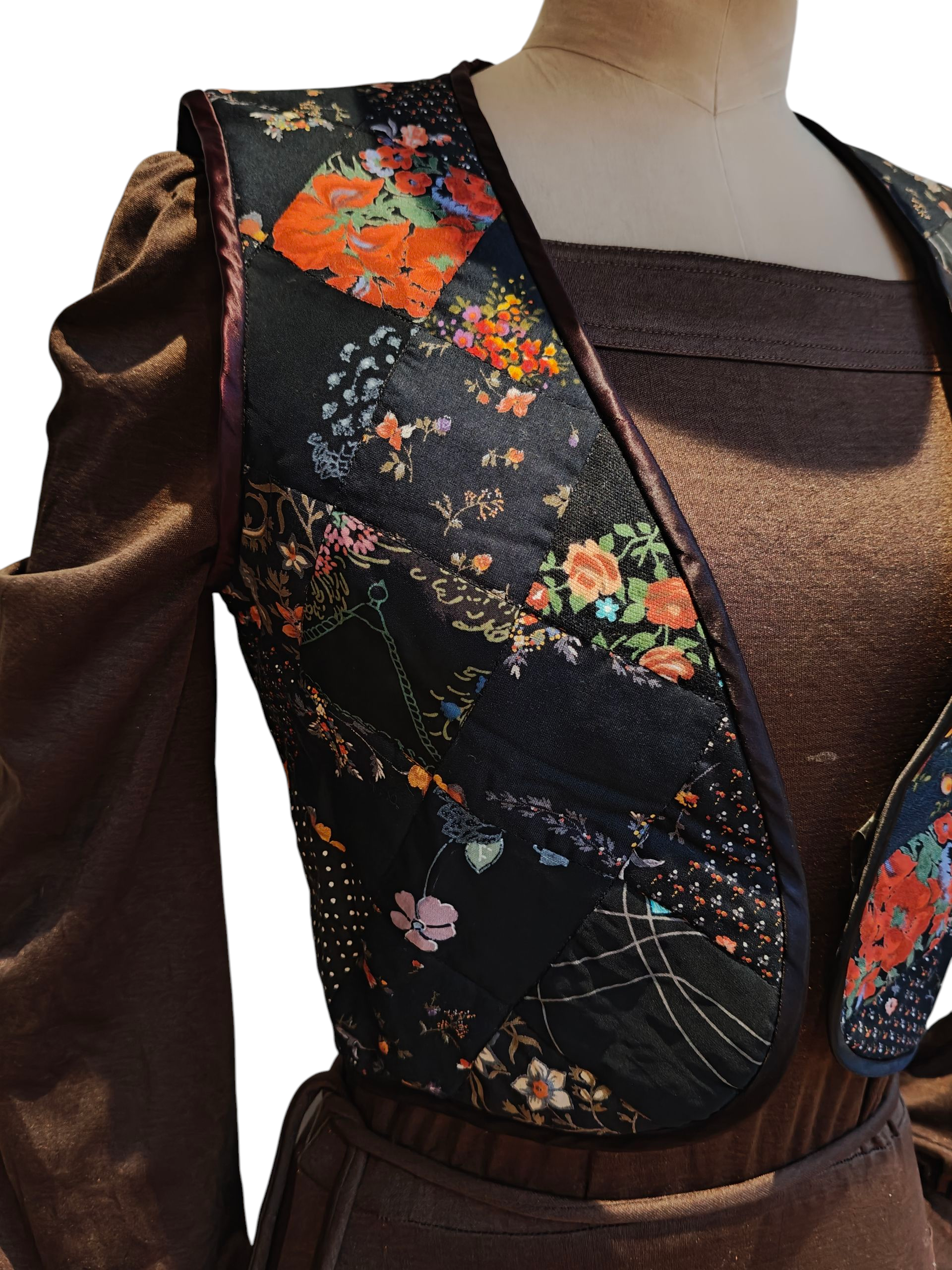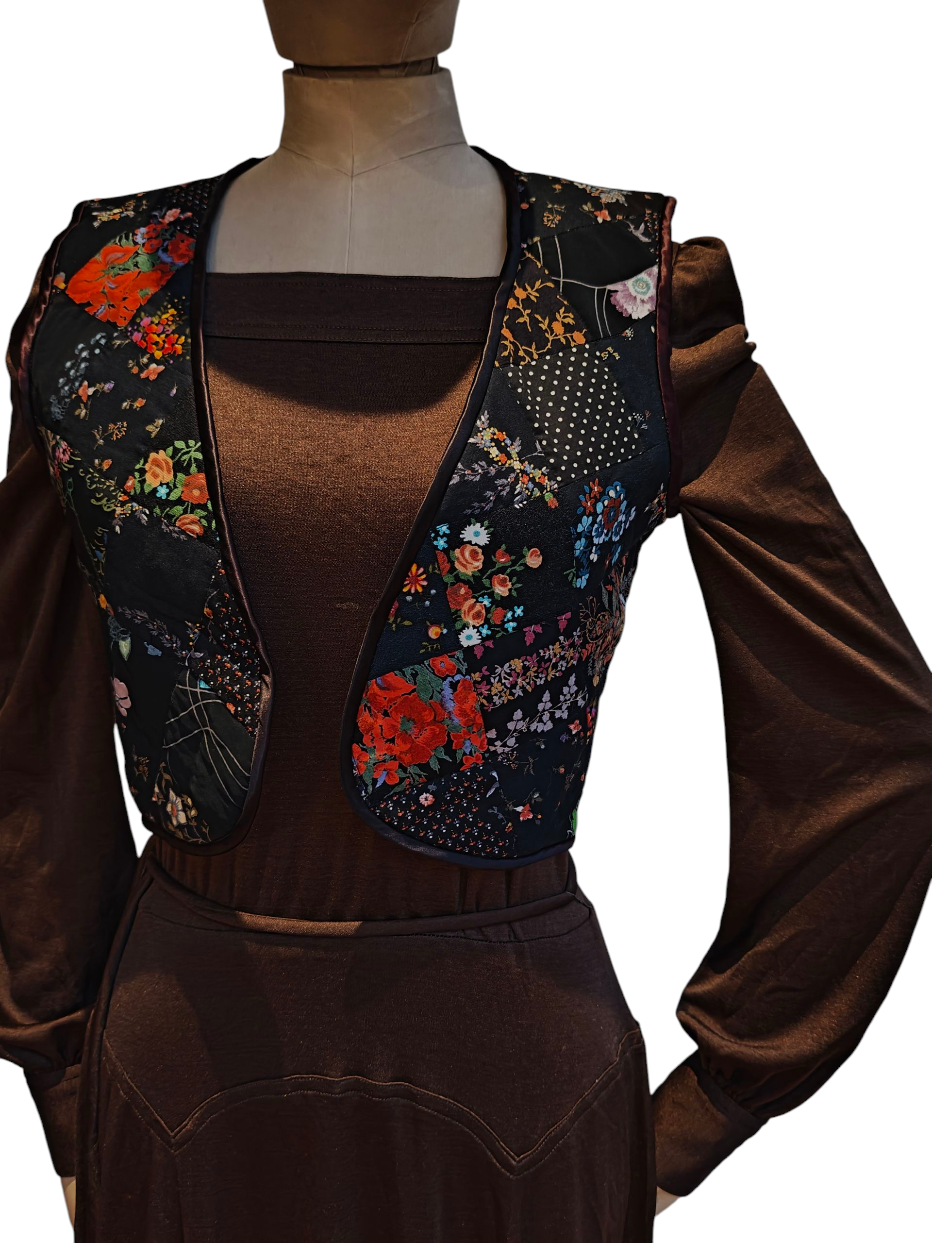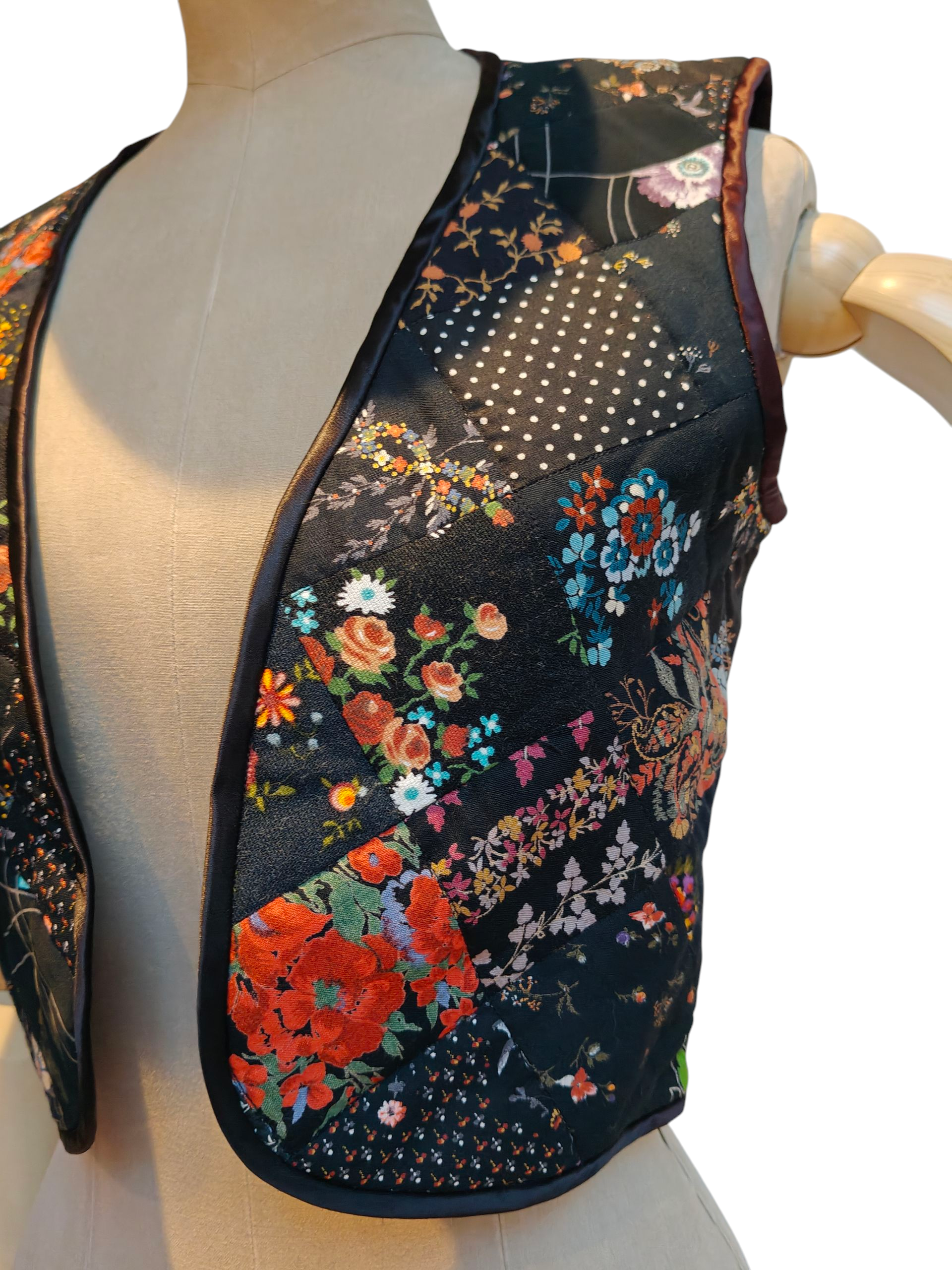 This is another of my fav's, and really is a pretty design. Lined and slightly wadded to give the quilted style, this is a really great style to wear over most items of clothing - modern or vintage. Black in background colour, the variety of pretty vintage floral fabrics is perfect. It's finished off with a silk look bias binding trim around the edges.