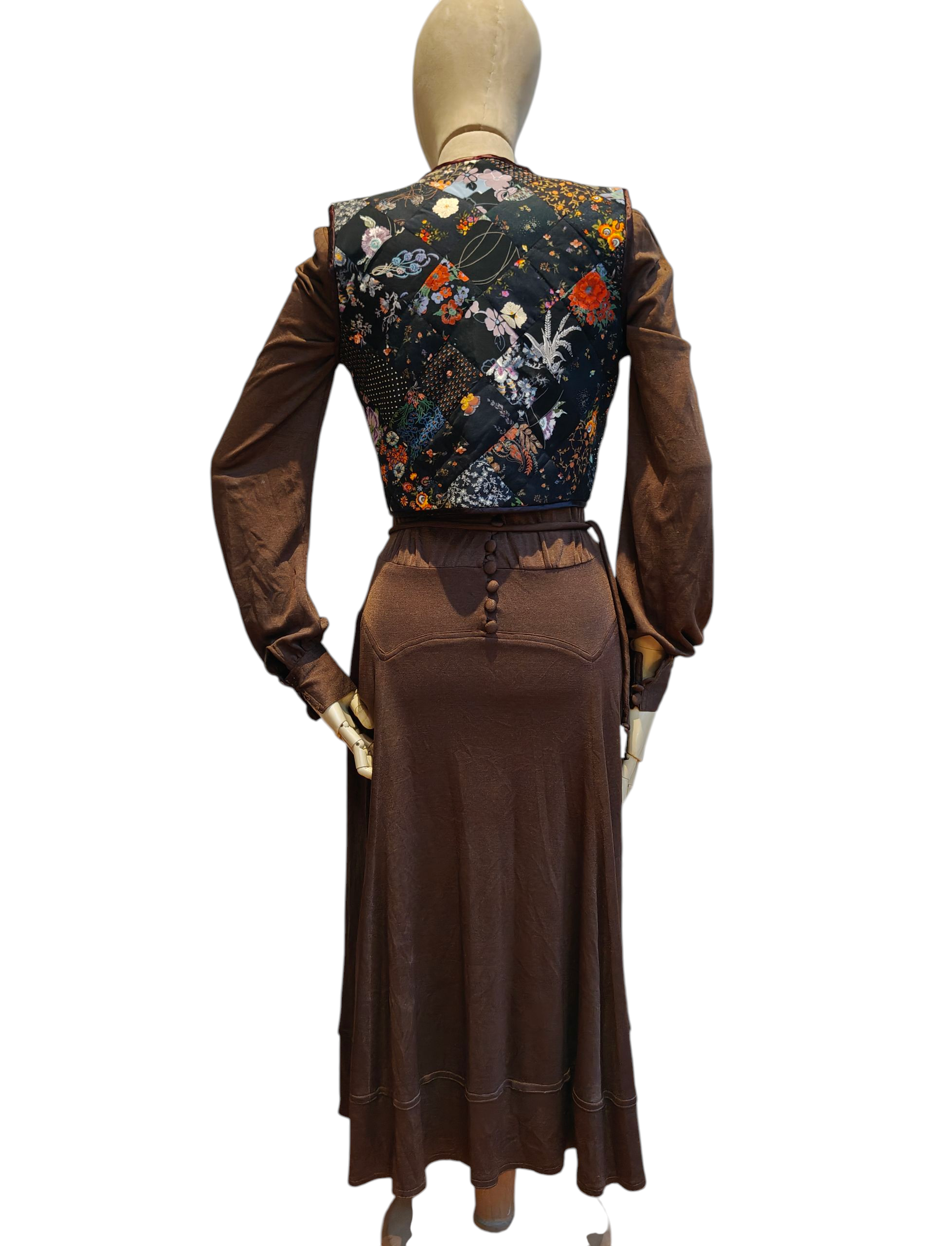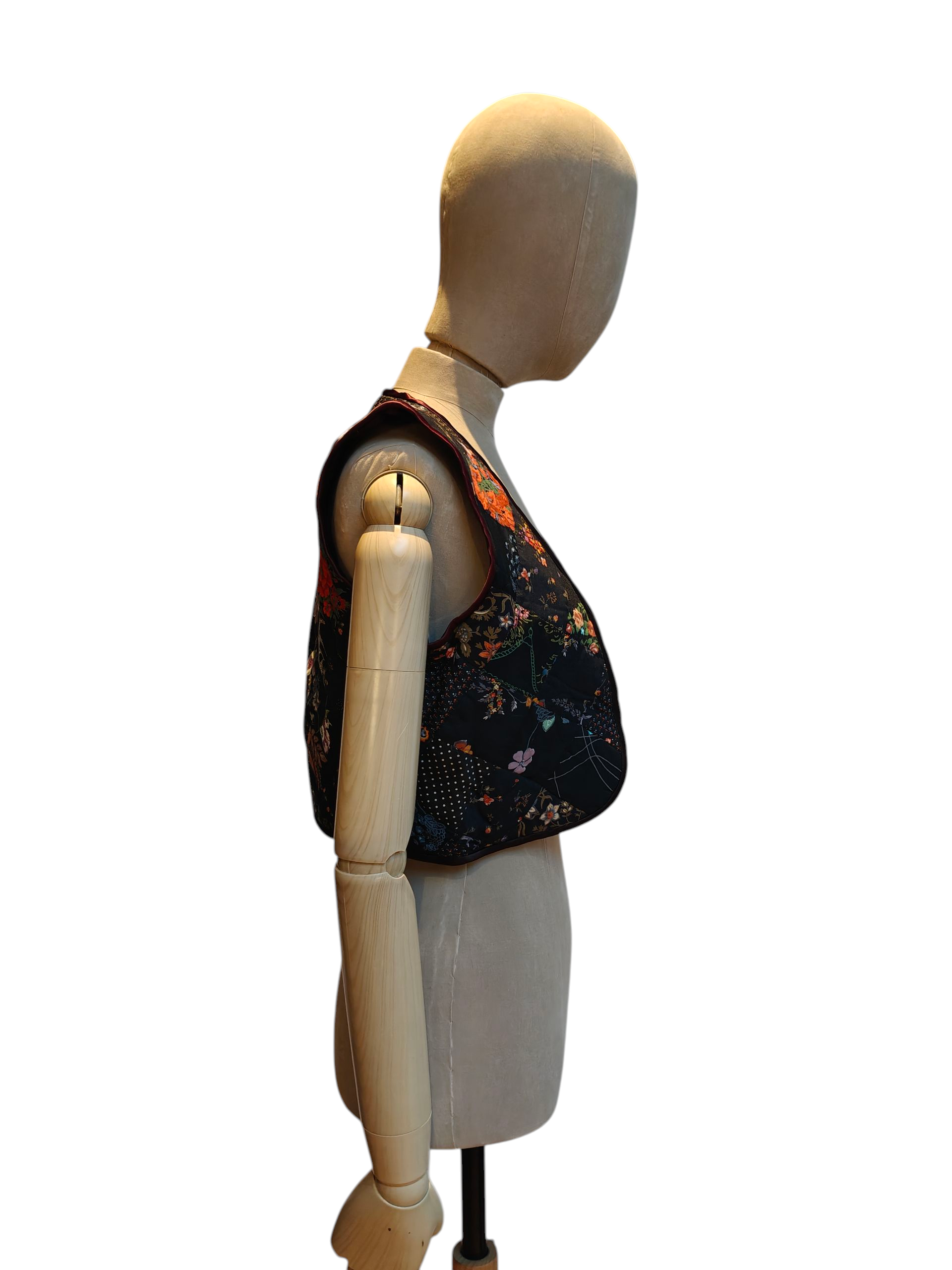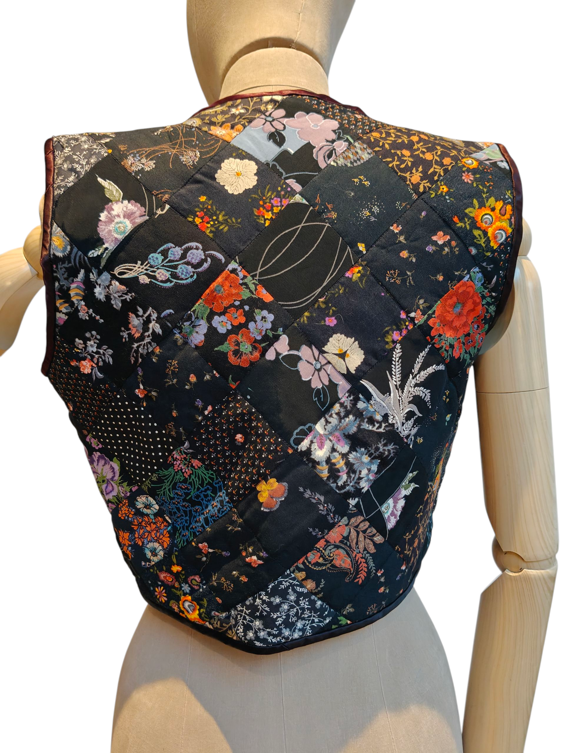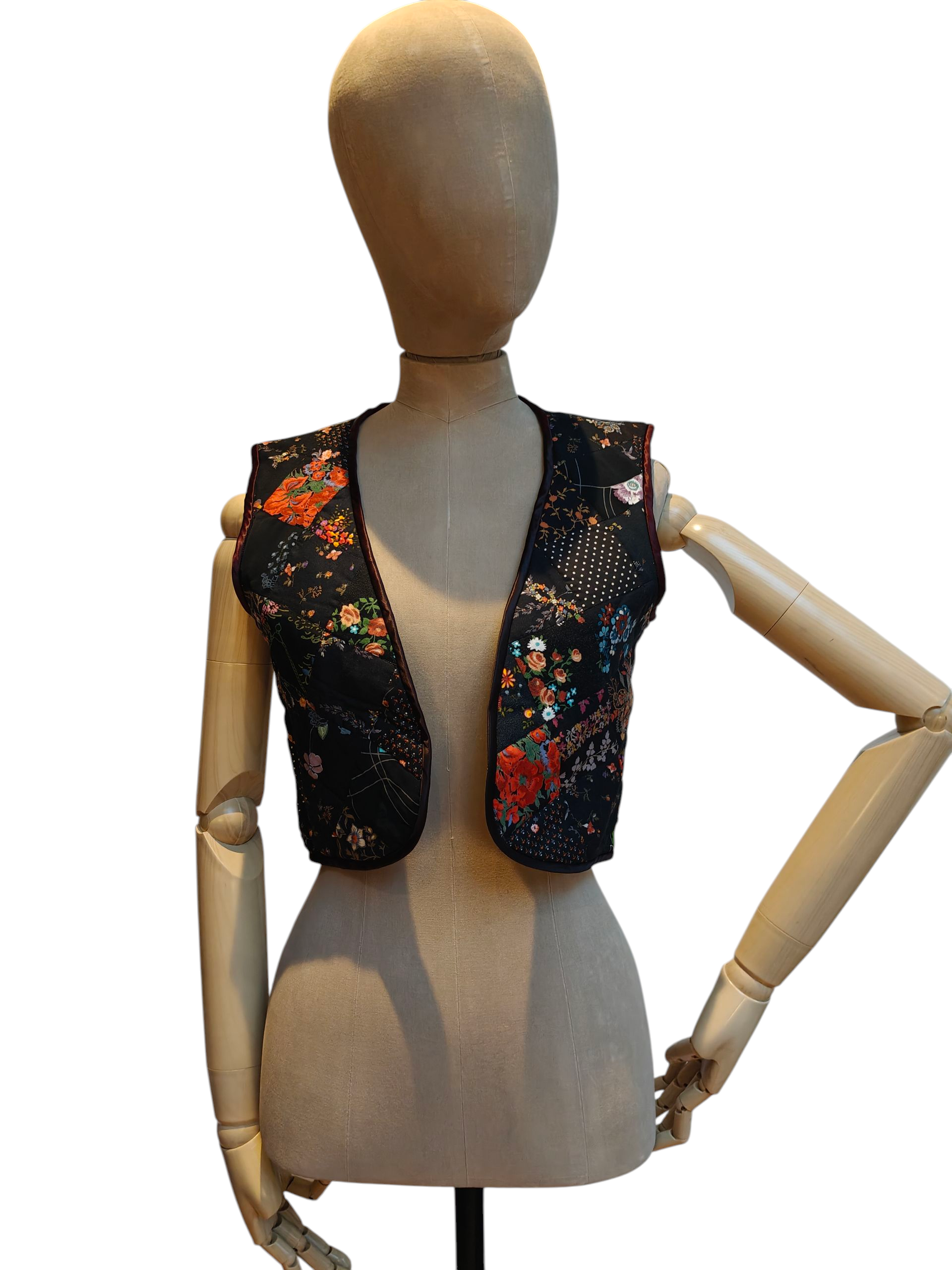 This is another of my fav's, and really is a pretty design. Lined and slightly wadded to give the quilted style, this is a really great style to wear over most items of clothing - modern or vintage. Black in background colour, the variety of pretty vintage floral fabrics is perfect. It's finished off with a silk look bias binding trim around the edges.