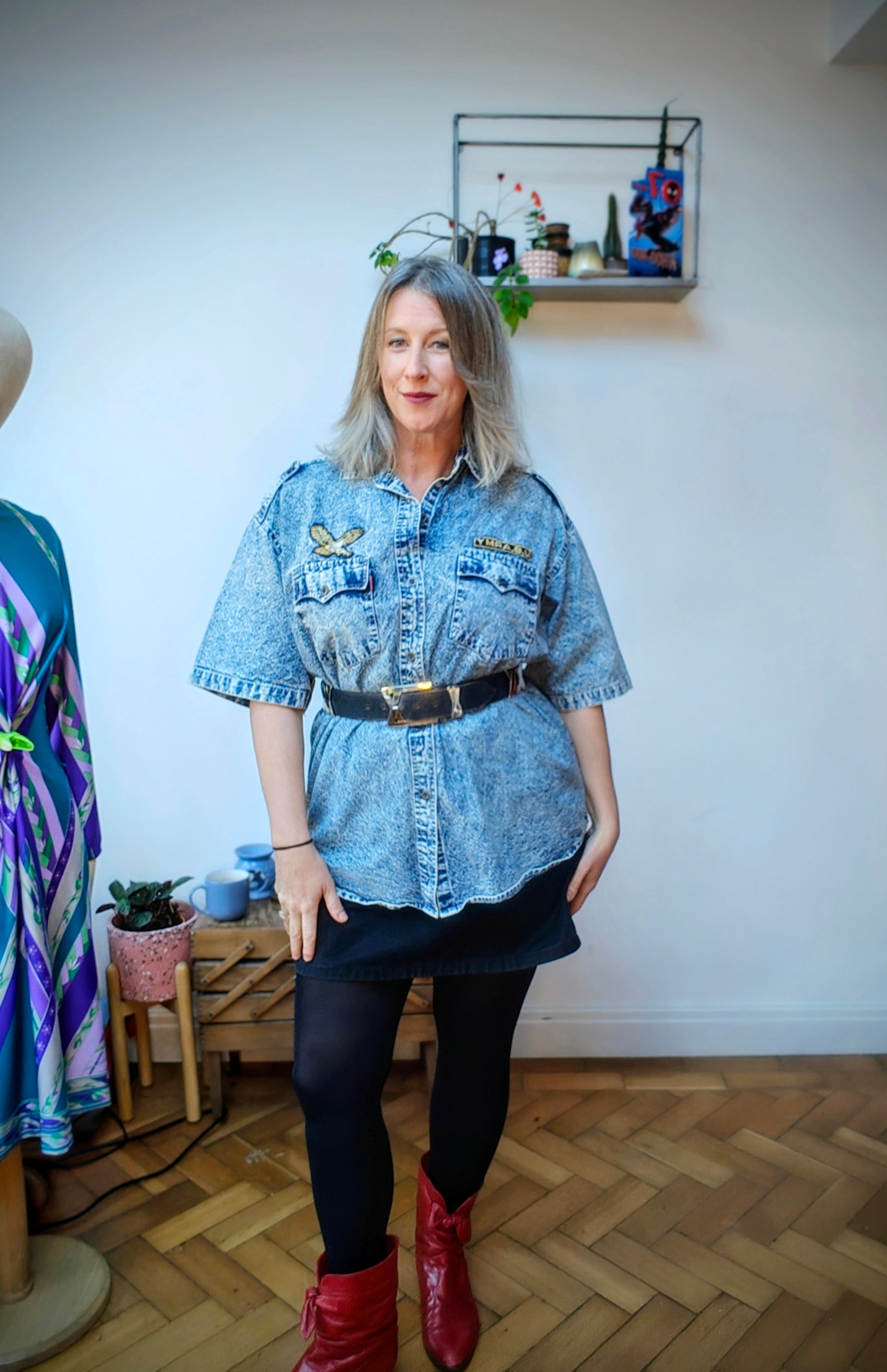 This shirt could be completely unisex and has short sleeves. Its a great acid wash blue denim and has the Orange Levi's tab on the pocket. It looks great worn open over a T-shirt or fastened. I estimate this to be from the 1980's however the Orange Levi's tab and the Solex Label do seem to make this date earlier.