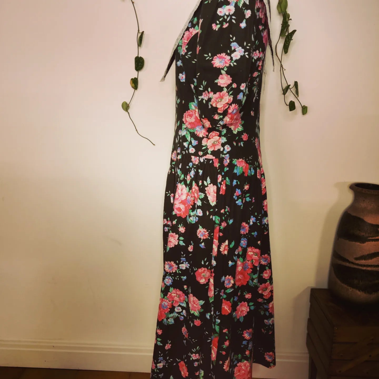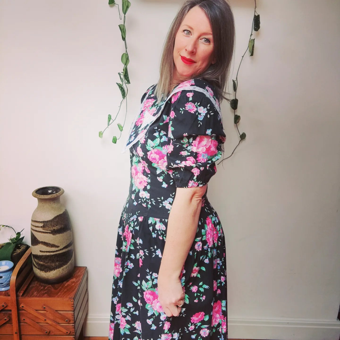 This gorgeous black floral dress is a must-have for any vintage-inspired wardrobe. With a beautiful lace trimmed collar, it's a perfect example of the classic 80s Laura Ashley style. It feels like cotton so it's easy to care for and features removable shoulder pads.
