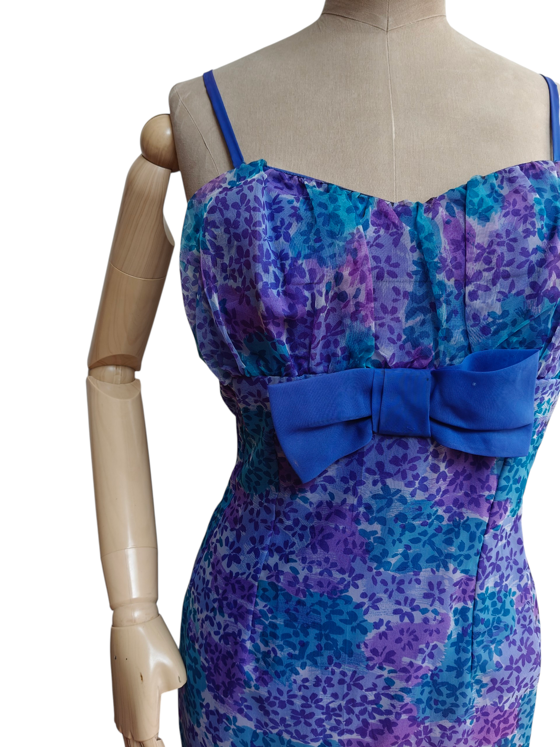 This lilac floral vintage dress is a stunner. She fits in all the right places to make her super flattering and extremely glamorous.
